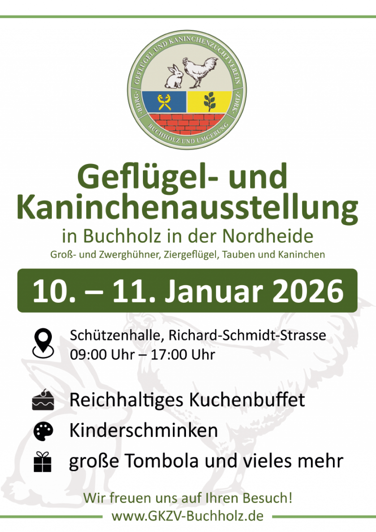 Die Ausstellung findet vom 10. bis 11. Januar 2026 in der Schützenhalle Buchholz i.d.N. statt (Zufahrt über die Richard-Schmidt-Straße). Wie in den vergangenen Jahren erwarten wir zahlreiche Tiere verschiedenster Rassen – darunter Hühner, Tauben, Enten, Gänse und Kaninchen – in einer bunten Vielfalt von Farben und Größen.